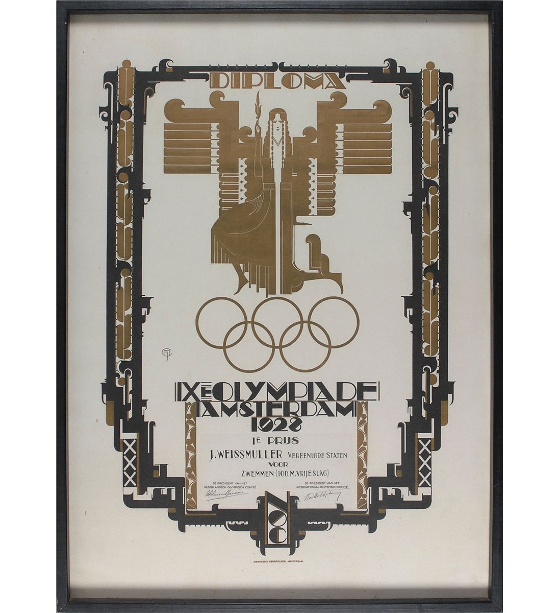 Gorgeous original 1928 Amsterdam Olympic Games diploma awarded to Weissmuller for placing first in the 100 meter swim, 20.75 x 29, bearing pre-printed signatures of the Olympic committee presidents. Framed to an overall size of 22 x 30.5. In fine condition. Originates from the estate of Weissmuller’s stepdaughter, Lisa Weissmuller Gallagher. The exquisite Art Deco certificate was designed by Dutch artist Chris van der Hoef and printed by Senefelder of Amsterdam. A truly one-of-a-kind piece. Oversized.