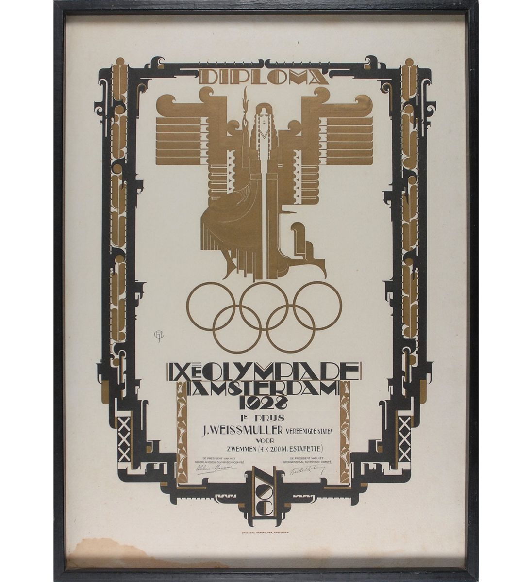 Striking original 1928 Amsterdam Olympic Games diploma awarded to Weissmuller for placing first in the 4 × 200 meter relay, 20.75 x 29, bearing pre-printed signatures of the Olympic committee presidents. Framed to an overall size of 22 x 30.5. Dampstaining to the lower border, otherwise fine condition. Originates from the estate of Weissmuller’s daughter, Lisa Weissmuller Gallagher. The exquisite Art Deco certificate was designed by Dutch artist Chris van der Hoef and printed by Senefelder of Amsterdam. Oversized.