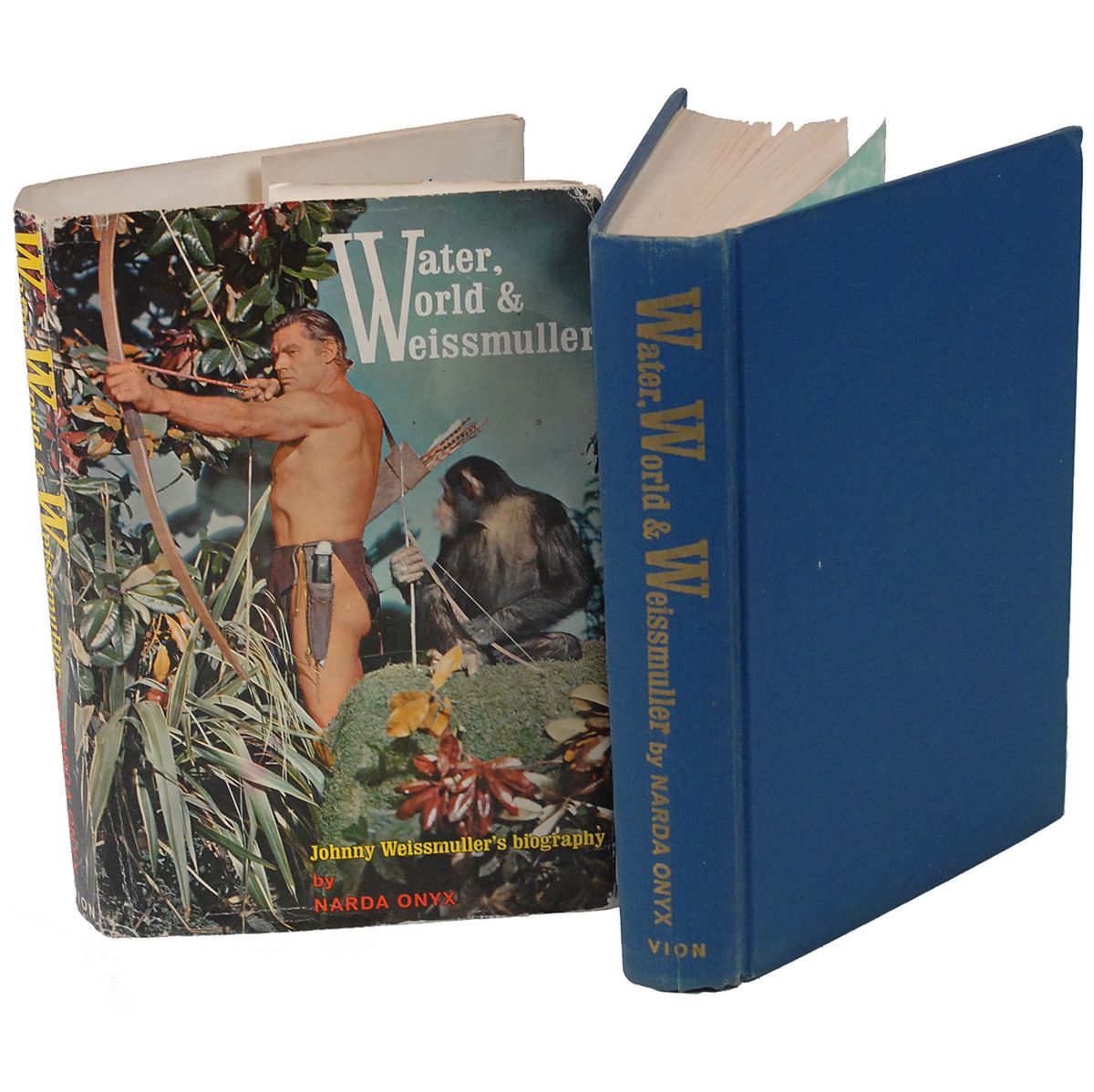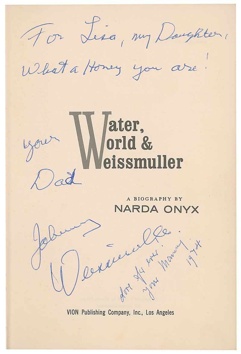 Signed book: Water, World & Weissmuller. First edition. Los Angeles: VON Publishing, 1964. Hardcover with dust jacket, 6 x 8.5, 330 pages. Signed and inscribed on the title page in blue ballpoint, “To Lisa, my daughter, what a honey you are! Your dad, Johnny Weissmuller,” and signed and dated 1974 by another family member. General wear and creases to dust jacket, otherwise fine condition. Originates from the estate of Weissmuller’s daughter, Lisa Weissmuller Gallagher.