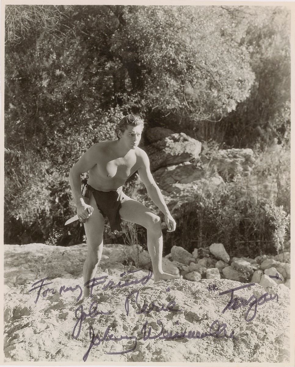 Glossy 7.75 x 9.5 photo of a dagger-wielding Tarzan stalking along a jagged outcropping, signed and inscribed in black felt tip, “For my friend, John Perie, Johnny Weissmuller, ‘Tarzan.’” Slight scattered creasing and trimmed edges, otherwise fine condition.
