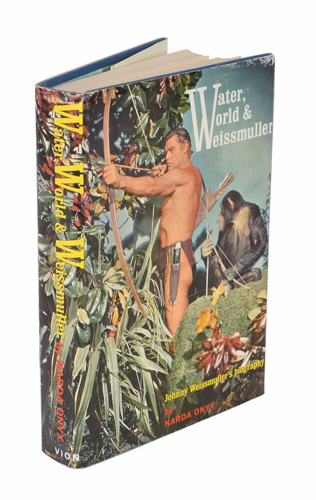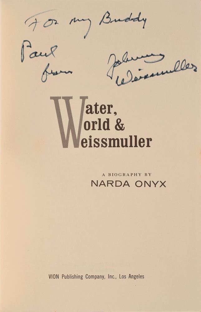 Collection of Weissmuller's personal membership cards, mostly dating to the 1960s and 1970s, plus a signed book. Signed cards include: Sherwood Golf & Country Club, International Sportsman's Club, BSP Insurance Company, Social Security Health Insurance, and National Car Rental VIP Club (signature very faded). Unsigned cards include: Hollywood Hackers Celebrity Golf Club, Screen Actors Guild, Screen Actors Guild Health and Welfare Plan, and a United States Lines meal card. The book is a biography entitled Water, World & Weissmuller, hardcover with dust jacket, signed and inscribed on the title page in black felt tip, "For my Buddy, Paul, from Johnny Weissmuller." In overall very good to fine condition, with significant wear and creasing to some of the cards. Originates from the estate of Weissmuller's stepdaughter, Lisa Weissmuller Gallagher.