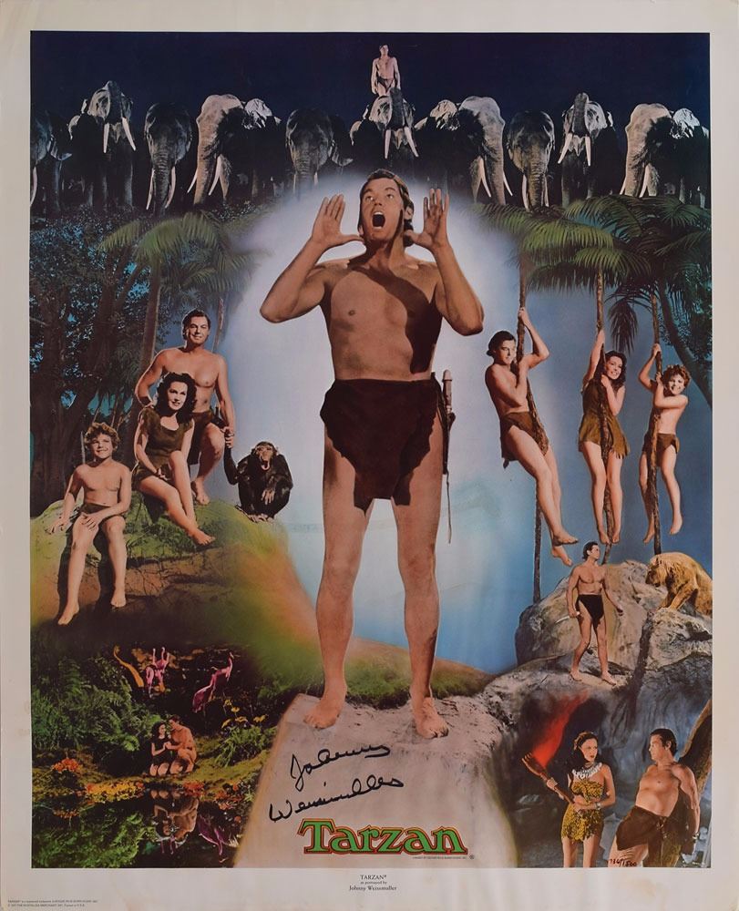 Color limited edition 24 x 30 print entitled 'Tarzan as Portrayed by Johnny Weissmuller,' numbered 736/1500, depicting several scenes and characters from the Tarzan movies, signed in black felt tip. In fine condition, with light dampstaining to the borders. Accompanied by its now seldom-seen original certificate of authenticity from Nostalgia Merchant.