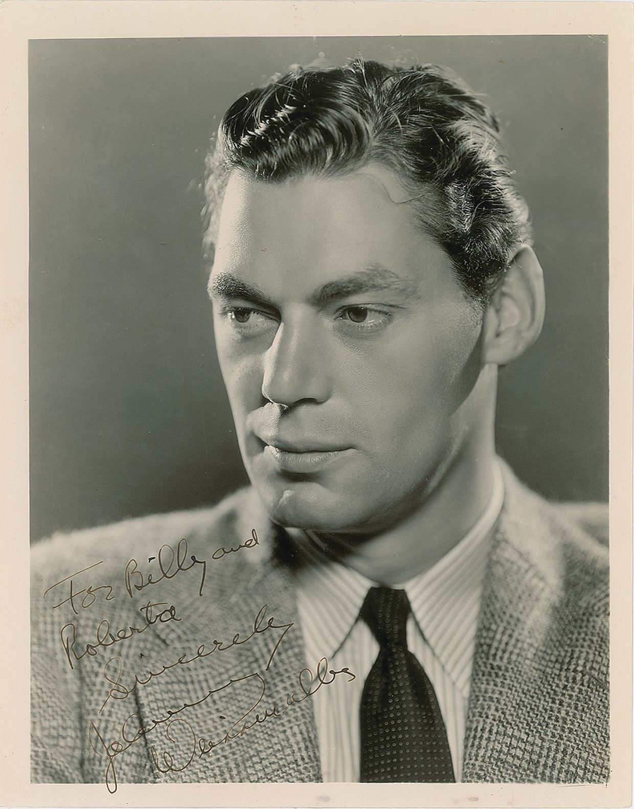 Sharp vintage glossy 8 x 10 photo of Weissmuller in a handsome suit and tie, signed and inscribed in fountain pen, "For Billy and Roberta, Sincerely, Johnny Weissmuller.” In fine condition, with a crease to the lower left corner tip.