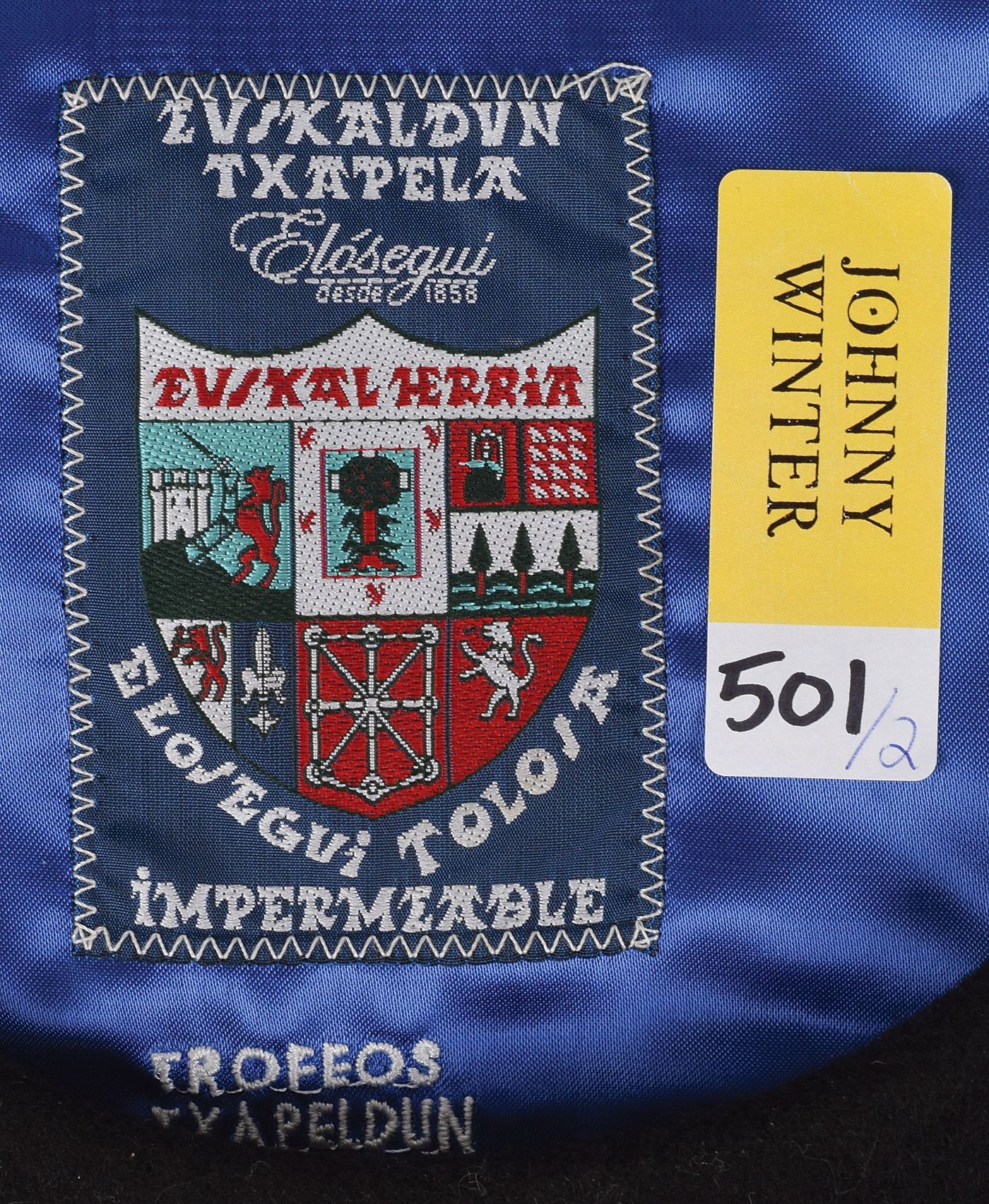 Five items: a Still Alive and Well album signed on the front cover in black felt tip by Johnny Winter; a large black wool beret by Elosegui of Tolosa, 14.25? in diameter, worn by Winter at the 2011 Hondarribia Blues Festival, with the event name embroidered around the top in red and green thread; official 2011 Blues Hondarribia Award presented to Winter, 5.5 x 4.5 x 3.5, depicting a Spanish stone tower redolent of the fortified walls of the Old Town district; a maroon stretch guitar strap by No. 1 of Hamburg, approximately 51? in length, personally used by Winter; and a green t-shirt, size medium, designed for The Reunion Concert, the 10th Anniversary Woodstock Festival on September 8, 1979, listing Winter as one of the performers. In overall very good to fine condition, with scattered creasing and a ring of wear to album. Accompanied by two photos of Winter wearing the beret at the Hondarribia Blues Festival.