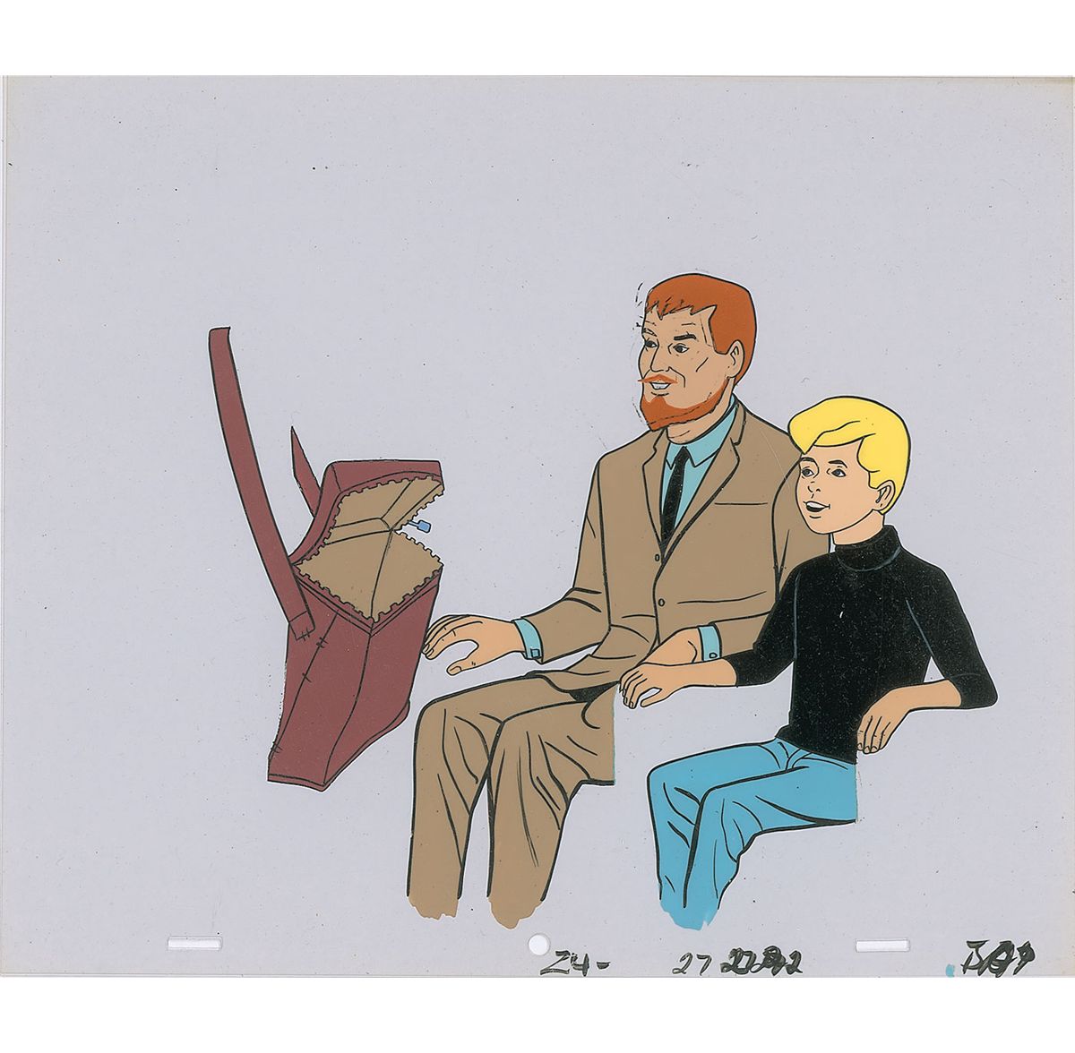 (Hanna-Barbera Studios, 1964) Original matched set of production cels featuring Johnny and Dr. Quest from Johnny Quest, showing them seated in front of a satchel. Character images measure 4.5 x 6 and 4.75 x 7.5, with overall dimensions of 12.5 x 10.5. In fine condition.
