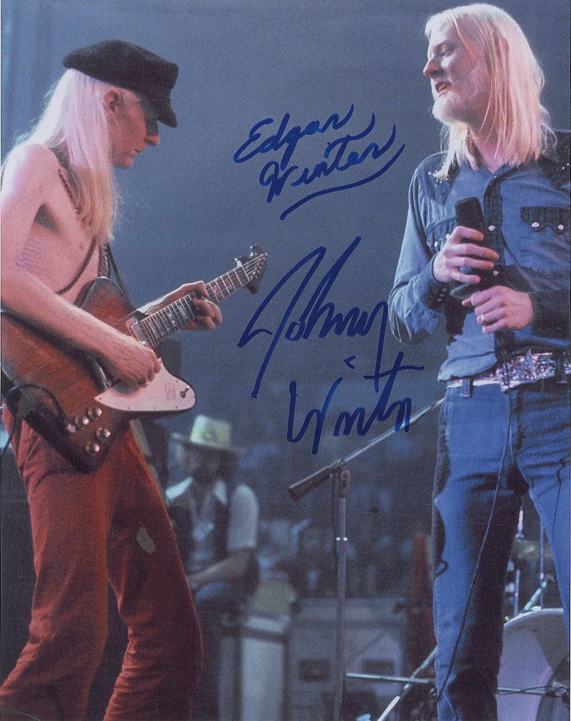 Color glossy 11 x 14 photo of the brothers on stage, signed in blue felt tip by both. In fine condition, with a few spots to the finish on the left side.