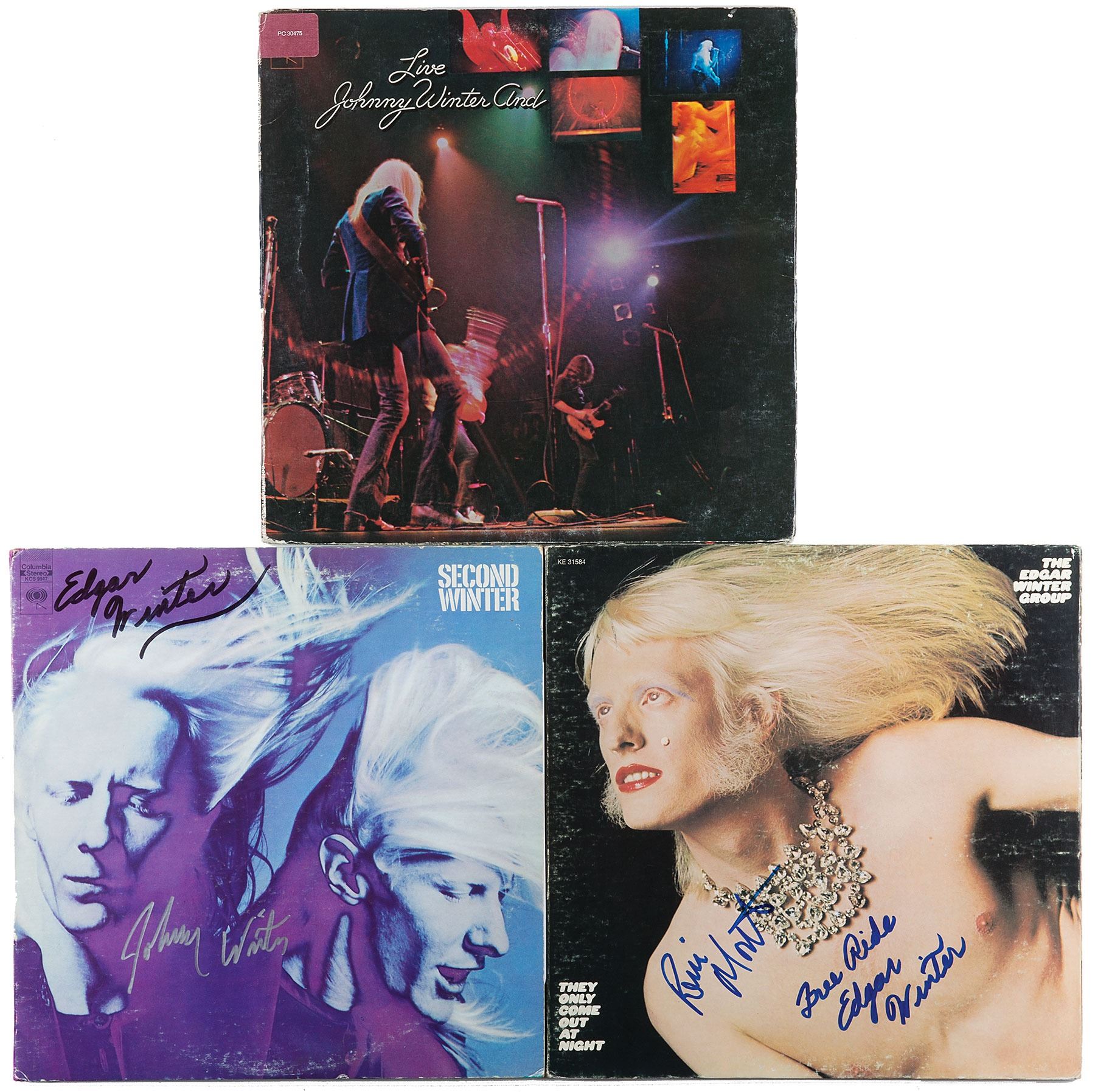 Group of three albums: Second Winter, signed on the front cover in silver ink by Johnny Winter and in black felt tip by Edgar Winter; Live Johnny Winter And, signed on the gatefold in silver ink by Johnny Winter and Rick Derringer; and They Only Come Out at Night, signed on the front cover in blue felt tip by Edgar Winter and Ronnie Montrose. In very good to fine condition, with light scuffing. The consignor notes that all signatures were acquired in person Ohio: Johnny Winter signed during a recent solo tour, Edgar Winter signed during two separate solo tours, Rick Derringer signed at the Fairlawn Hilton in 1986, and Ronnie Montrose signed during his final solo tour at the Cleveland Odeon. The records for Second Winter and Live Johnny Winter And are included.