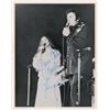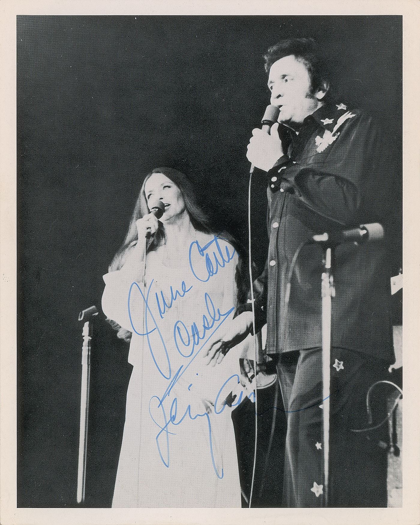 Semi-glossy 8 x 10 paperstock photo of the couple performing on stage, signed in blue felt tip, "June Carter Cash" and "Johnny Cash." In fine condition. From the Harvey and Rhoda Kuflik Collection.
