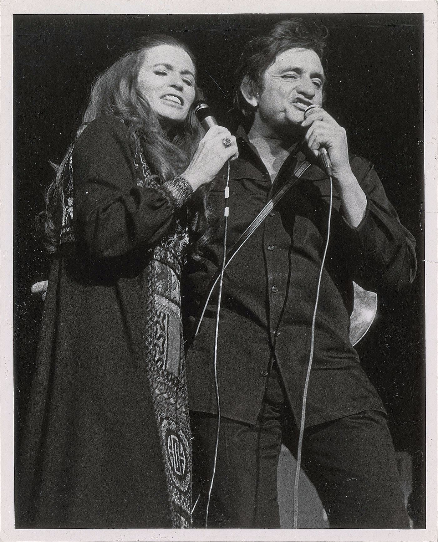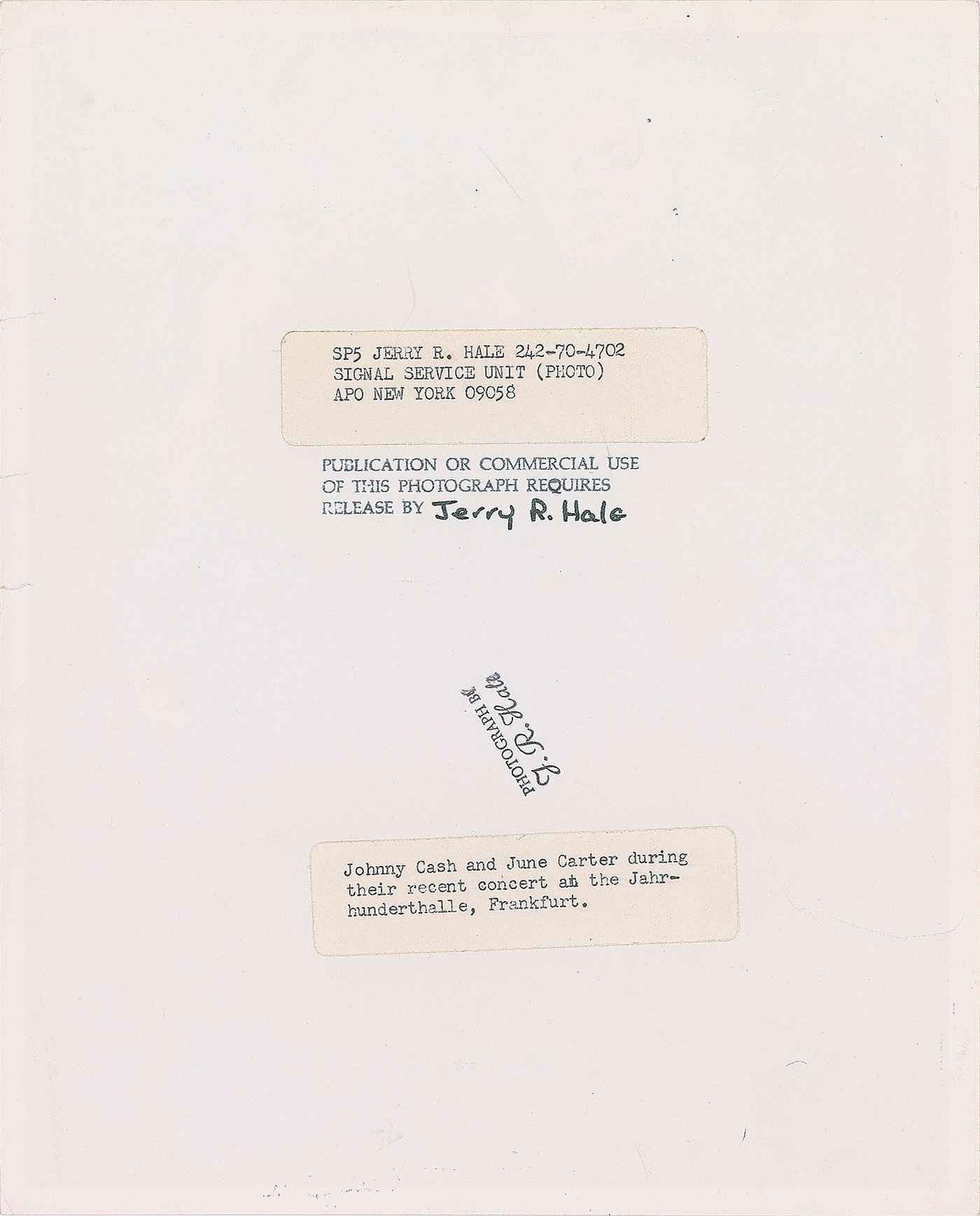 Original vintage circa 1970 glossy 8 x 10 silver gelatin photo of Johnny Cash and June Carter Cash singing together during a concert at the Jahrhunderthalle in Frankfurt, Germany. Reverse bears a Jerry R. Hale credit notation and affixed caption label. In fine condition, with a horizontal scratch to top edge and tiny tears to right border.