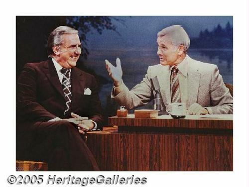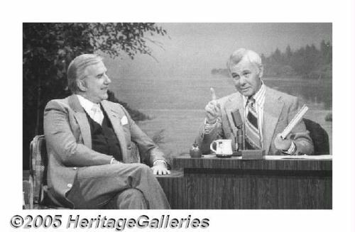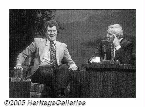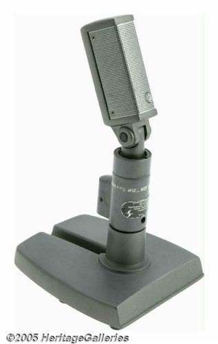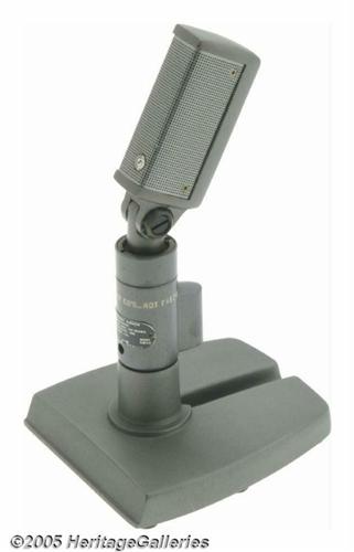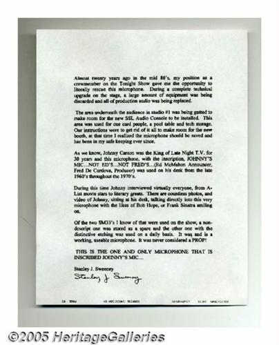 <B>"Johnny's Mic... Not Ed's... Not Fred's"</B></I> to quote from the white engraved inscription clearly visible on the collar of this Shure SM33 microphone. That white engraving distinguishes this piece as Johnny's <I>Tonight Show</B></I> microphone, as can be clearly seen in the many photos of the mic sitting on Johnny's desk. As <I>Tonight Show</B></I> sound man Stan Sweeney writes in his COA, "This is the one and only microphone that is inscribed 'Johnny's mic . . ' and this one with the distinct etching was used on a daily basis." To our knowledge, this is the only Shure SM 33 that Johnny ever used on <I>The Tonight Show.</B></I> That says it all! <BR><BR>If only this mic could talk. Through the administrations of seven U.S. presidents, Johnny Carson was the undisputed king of late night television with <I>The Tonight Show Starring Johnny Carson</B></I>. We all remember him sitting at his desk nervously playing with his pencils, adjusting this very microphone, swapping jokes and stories with guests that included legends in all fields of endeavor of the late 20th century. <BR><BR>The story of how this microphone was "rescued" is told by the current owner: "Almost twenty years ago in the mid 80s, my position as a crew member of <I>The Tonight Show</B></I> gave me the opportunity to literally rescue this microphone. During one of our technical upgrades at NBC, a large amount of equipment was being discarded along with this microphone. It was not uncommon for the studios at the time to just get rid of antiquated equipment. All of production audio was being replaced. I realized the mic should be saved, and its been in my safekeeping ever since. As we all know, Johnny Carson was the King of late night TV for thirty years and this microphone, with the inscription, <I>Johnny's Mic... Not Ed's... Not Fred's</B></I> (Ed McMahon, Announcer; Fred DeCordova, Producer) was used on his desk from the late 1960s throughout the 1970s." <BR><BR>Technically, this microphone is (to quote from Shure's spec sheet) "... a compact and rugged unidirectional ribbon microphone combining wide range response and a Super-Cardioid directional pattern. The performance characteristics are ideal for studio use in broadcasting and recording and for critical sound reinforcement applications." Emotionally, this microphone is a part of history, an American icon, an incomparable piece of pop culture. Since Carson's recent death, a number of celebrities have expressed interest in owning this museum-worthy Johnny Carson microphone. Heritage Galleries is proud to be chosen to offer this once in a lifetime opportunity to the general public. Impeccable provenance provided in the form of a signed letter by former <I>Tonight Show</B></I> crew member and sound man, Stanley J. Sweeney.