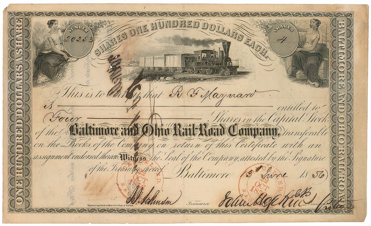 American entrepreneur, abolitionist and philanthropist (1795–1873) whose legacy lives on in numerous foundations and institutions, such as Johns Hopkins Hospital and Johns Hopkins University. Partly-printed DS, one page, 10.25 x 6.25, June 13, 1856. Stock certificate issued to R. F. Maynard for four shares in the capital stock of the Baltimore and Ohio Railroad Company. Signed at the conclusion by Hopkins. In very good to fine condition, with light toning and soiling, and a small bit of ink erosion to one letter of the signature.