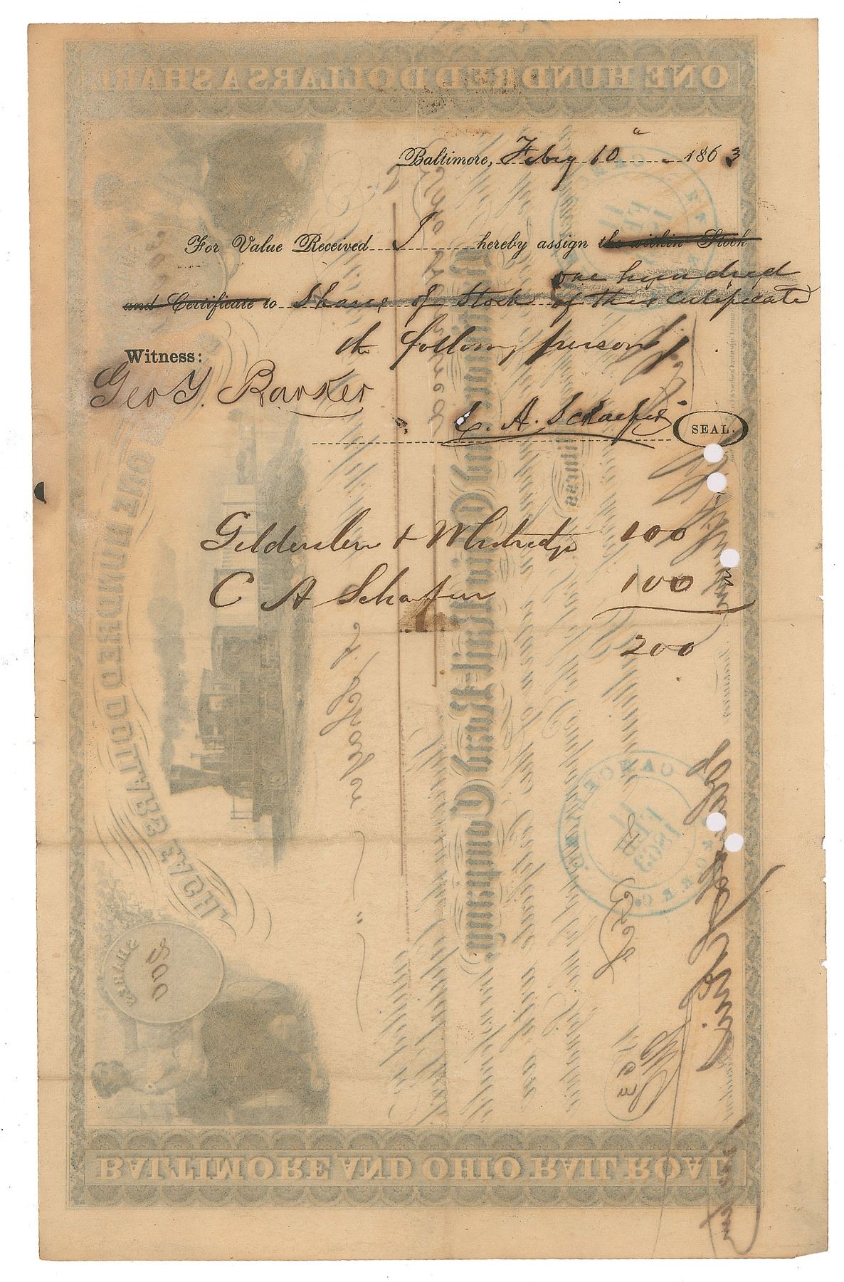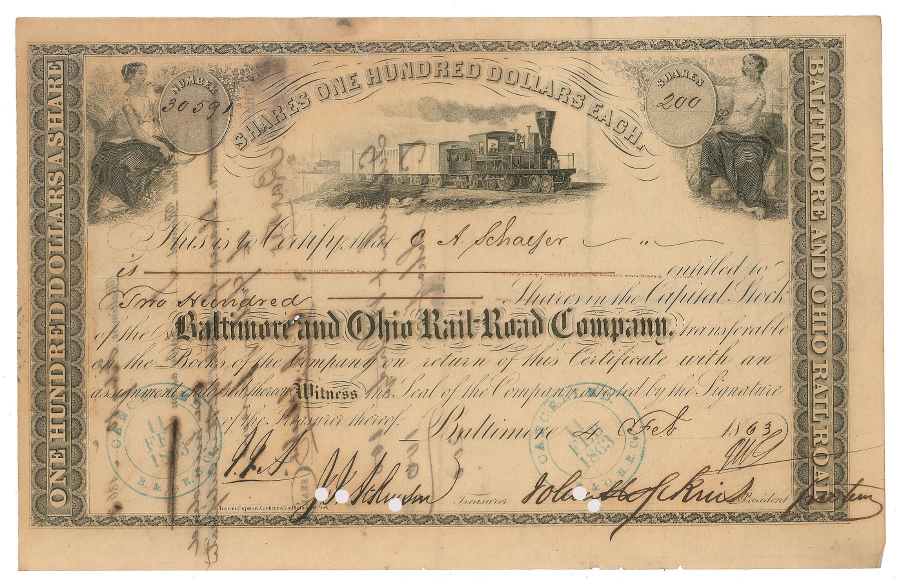 Partly-printed DS, one page, 10 x 6.5, February 4, 1863. Stock certificate for 200 shares in the Baltimore and Ohio Rail-Road Company issued to C. A. Schaefer, signed at the conclusion by Hopkins as the company's president. In fine condition, with two small cancellation holes touching the signature.