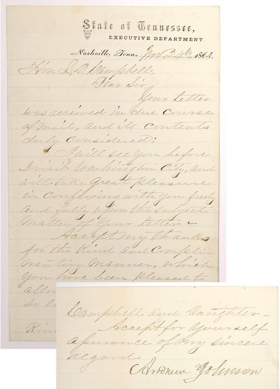 Johnson, Andrew. Document signed as Military Governor of Tennessee and Vice President-elect of the United States, 1¼ pp on engraved "State of Tennessee, Executive Department" stationery, Nashville, Tenn., Nov. 24, 1864. To Hon. S.D. Campbell, promising to see him before going to Washington City, "[I] will take great pleasure in conferring with you freely and fully upon the subject matter of your letter," and thanking him "for the kind and complimentary manner which you have been pleased to allude to one, who claims so littleā¦." Fine condition. Johnson would take office as Vice President on March 4, 1865 and upon Lincoln's assassination on April 14, 1865, would assume the presidency. His clashes with Radical Republicans, who controlled Congress, resulted in his impeachment in 1868; he was acquitted by one vote.