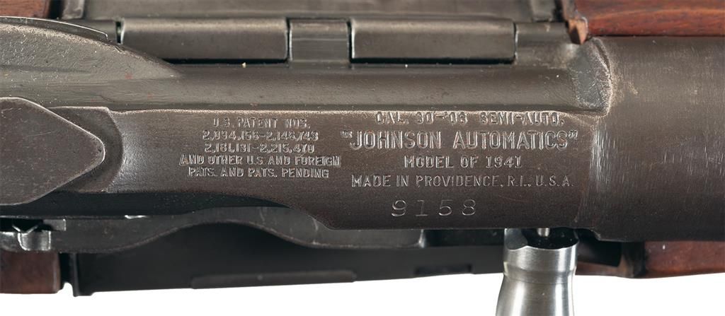 These rifles were designed by Melvin Johnson in 1939. This design was tested alongside the M1 Garand with the Garand proving victorious over the Johnson in 1941. Some Marine Corps Parachute and Raider Battalions acquired Johnson Model 1941s as a war expedient model and used them in the early island hopping campaign in the South Pacific during 1943. Having several unique features such as an easily removable barrel for storage in a parachute jump bag and a rotary magazine which held ten rounds and could easily and quickly be loaded with either a single or multiple rounds. The receiver is marked with the standard five line patent dates followed by the four line "JOHNSON AUTOMATICS/MODEL OF 1941" logo, address and the serial number "9158". The barrel is marked on the front of the barrel support "30-06/41" and with an "S", the lug is marked "1655J" and the barrel is marked "1655J". The bolt is stamped with the serial number "B6757". The right rear side of the receiver is stamped with a small five-pointed star over an inverted triangle with "CRANSTON/ARMS/CO." inside. The right side of the rear sight is stamped "METERS" with "M2" stamped on the left side. It is fitted with a replacement two-piece walnut stock with a serrated steel buttplate.