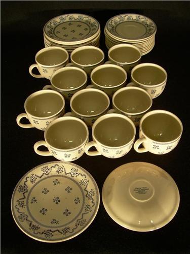 Johnson Bros English ironstone ''Petit Fleur'' dinnerware to include twelve tea cups and saucers and twelve dessert plates, blue floral transferware pattern on a cream ground.