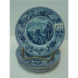 Historic America Johnson Bros bread & butter plates. Made in England. Lot of 8. Covered Wagon and the Rocky Mountains with oak leaf and acorn border. 6 3/8" diameter. Stick marks from kiln. Exc cond.