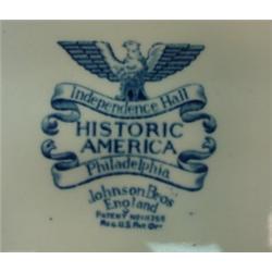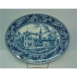 16" long X 12 1/2" wide Johnson Bros Historic America Oval Platter with Independence Hall, Philadelphia decal of this famous landmark. Oak leaf and acorn border. Made in England. Stick marks from kiln. Exc Condition.