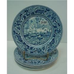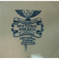Historic America Johnson Bros salad plates. Made in England. Sacramento City California with oak leaf and acorn border. 8" diameter. Stick marks from kiln. One has tiny 1/32" factory flaw in glaze. Otherwise exc cond.