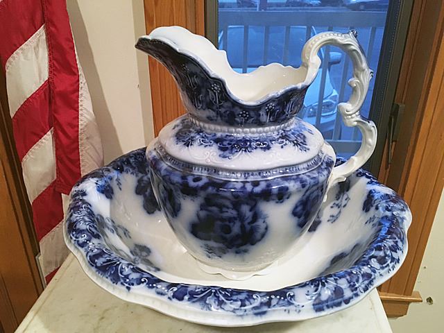 Stunning flow blue Johnson Bros., England pitcher and bowl set.
