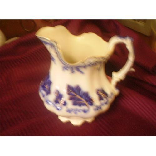 This is a beautiful turn of the century Johnson and Bros. Normandy Blue Flow pitcher. The pitcher stands 8 1/2" high and is 8" wide at the widest part of the base. There is some gold wear and one crack at the bottom of the base. The crack is only visible if turned upside down. There is little to no crazing on this piece. This is a great piece that would complete any collection.