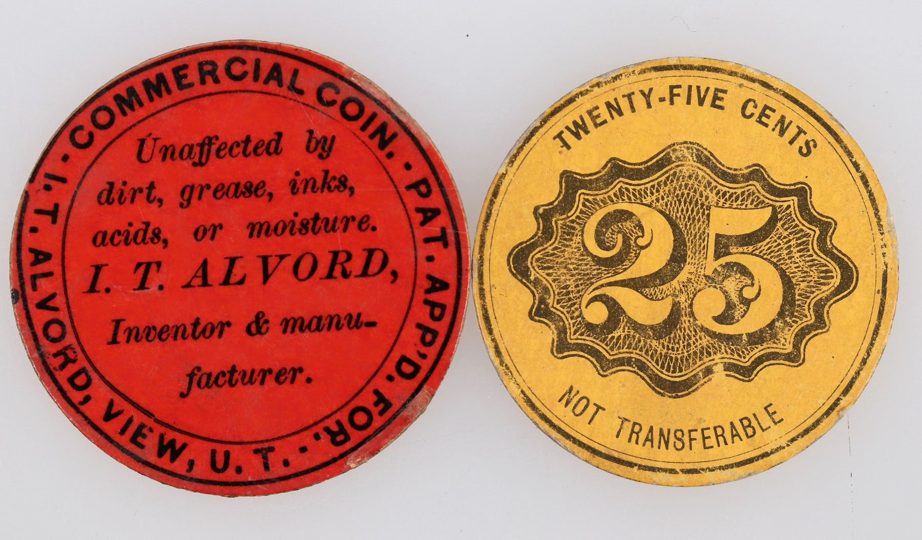 Two Unusual Cardboard Utah Tokens. 1) Johnson Bros., Huntington, Utah. "This check is good for twenty-five cents (around the perimeter) / In Goods / at the store of / Johnson Bros. / Gen'l Merchants / Huntington / Utah // Twenty-Five Cents / 25 (over ornate engraving) / Not Transferrable." Round, black on yellow cardboard, undated (1893-1910) 32mm, very fine. 2) I. T. Alvord, Inventor, View, U. T. "Commercial Coin / Pat. App'd For / I. T. Alvord (all around perimeter) / Unaffected by / dirt, grease, inks, / acids or moisture. / I. T. Alvord / inventor & manu- / facturer, // Merchandise (curving at top) / Will pay bearer (curving below) / Five / (signature of I. T. Alvord) / Cents." Round, black on red cardboard, undated (pre-1896), 32mm, very fine. Advertising himself as an inventor and manufacturer, I. T. Alvord printed this sample advertising cardboard token from his general merchandise business in View, Utah Territory. Douglas McDonald Collection.