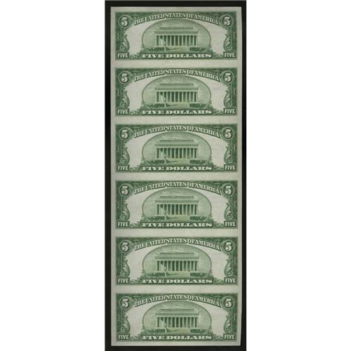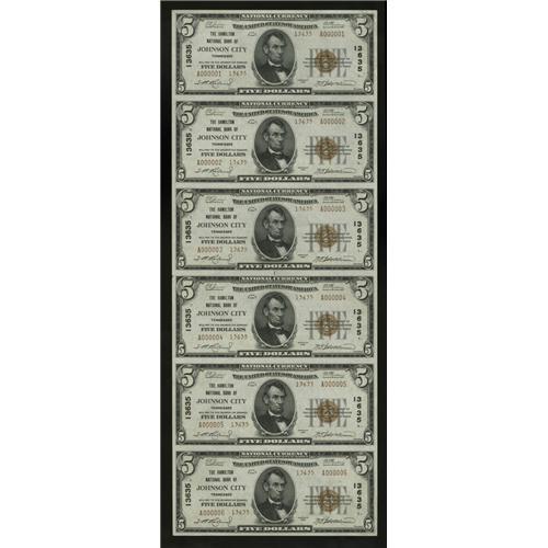 <B>Johnson City, TN</B></I> - $5 1929 Ty. 2 <B>The Hamilton NB</B></I> Ch. # 13635 Uncut Sheet<BR>This is an attractive serial number 1-6 uncut sheet from a state where first sheets are decidedly scarce. It is nicely centered and possesses excellent print detail. Closer inspection reveals handling in the top note. <B>Choice Crisp Uncirculated.</B></I><BR><BR><b>Shipping:</b> Coin/Currency (<a target="_blank" href="http://www.heritageauctions.com/common/shipping.php">view shipping information</a>)