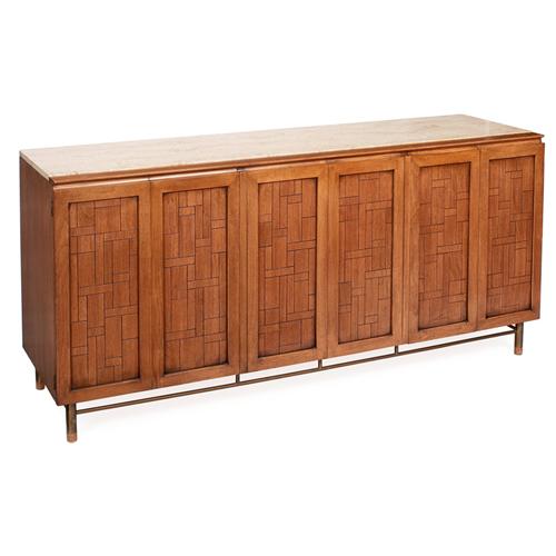 Johnson Furniture Co.sideboard, mahogany case with three sets of bi-fold doors with decorative patterning which conceal drawers and shelves, interior consists of eight drawers and one shelf, original travertine top, brass frame, original finish,72in.w x 2