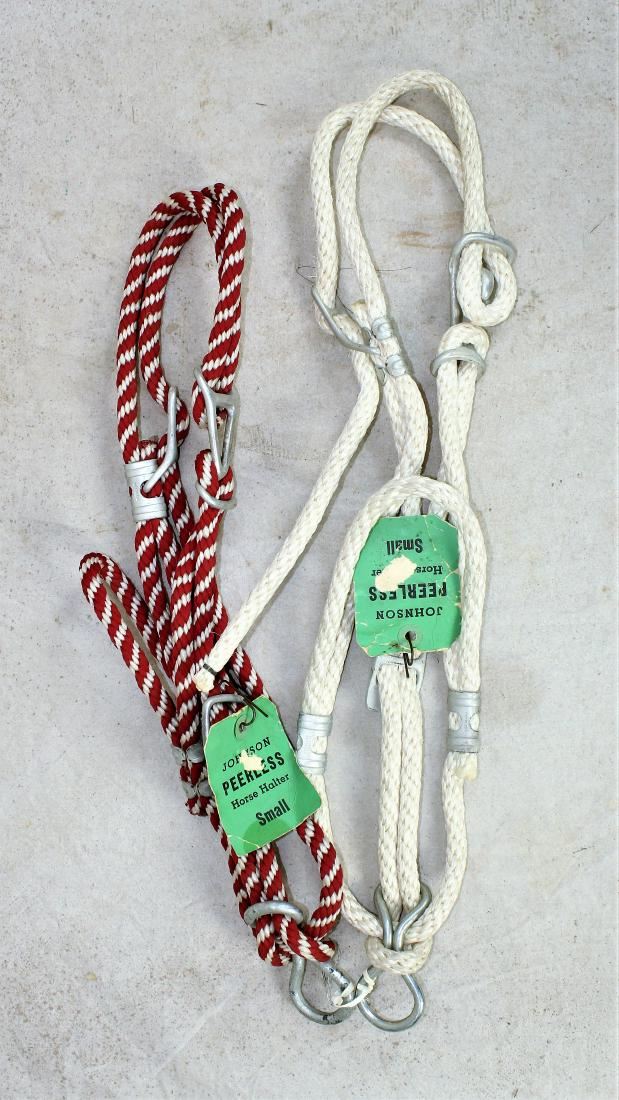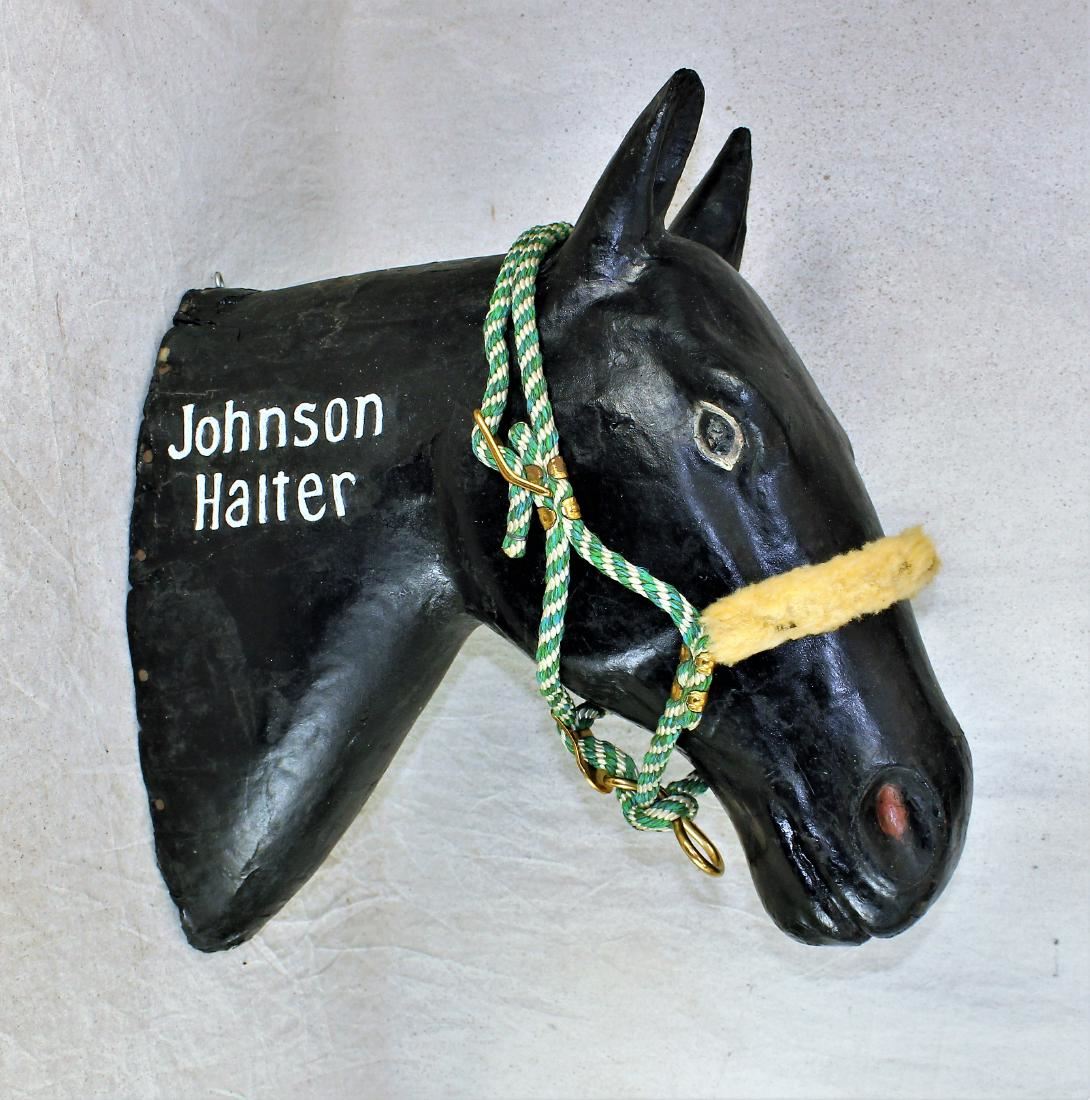Fantastic approximatley life size store owner's advertising display horse head with "Johnson Halter" on each side, accompanied by thre different colors of halters and original tags.