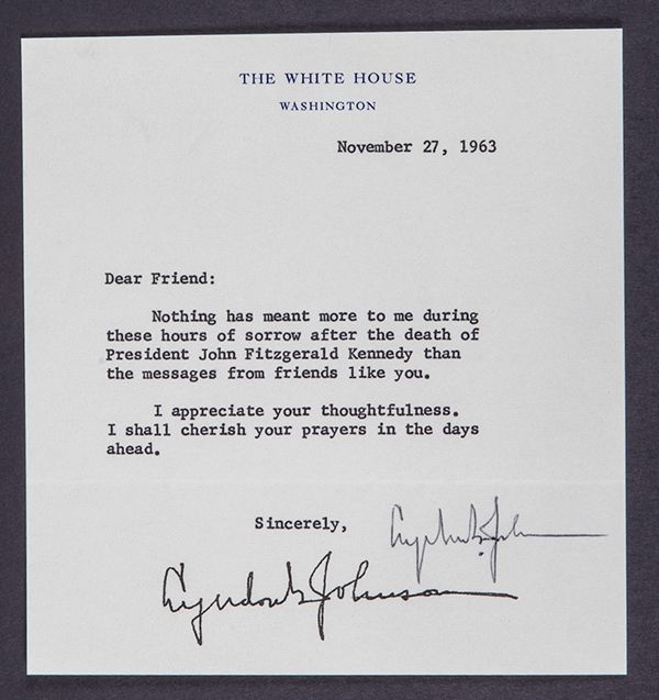 Johnson, Lyndon B (1908-1973) 36th President of the United States (1963-1969). Typed letter signed as President on The White House letterhead, 5½ x 5¾ in., Washington, 27 Nov. 1963. The letter says, "Dear Friend: Nothing has meant more to me during these hours of sorrow after the death of President John Fitzgerald Kennedy than the messages from friends like you. I appreciate your thoughtfulness. I shall cherish your prayers in the days ahead." The letter has a printed signature, but Johnson signed again in blue ball point pen above, and to the right of that signature.