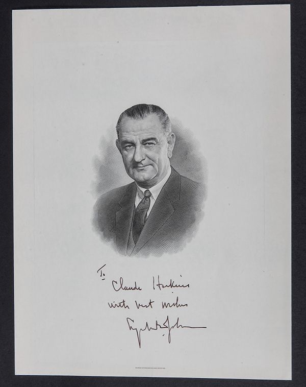 Johnson, Lyndon B. Signed, inscribed portrait from the Bureau of Engraving and Printing, "To Claude Harkins with best wishes Lyndon B. Johnson," 9 x 11¾ in., n.p., n.d. Signed after President Johnson's retirement to Austin, Texas. Excellent condition. Ex Claude Harkins Collection.