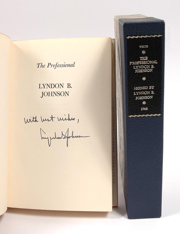 Johnson, Lyndon B (1908-73) 36th President of the United States (1963-1969). The Professional: Lyndon B. Johnson by William S. White, inscribed and signed "With best wishes Lyndon B. Johnson" on the half title page. Boston: Houghton Mifflin Company, 1964, 4to, 274pp. Book is fine. In worn dust jacket. Housed in a custom-made, blue, half leather, half marbled paper case with black label and gilt lettering.