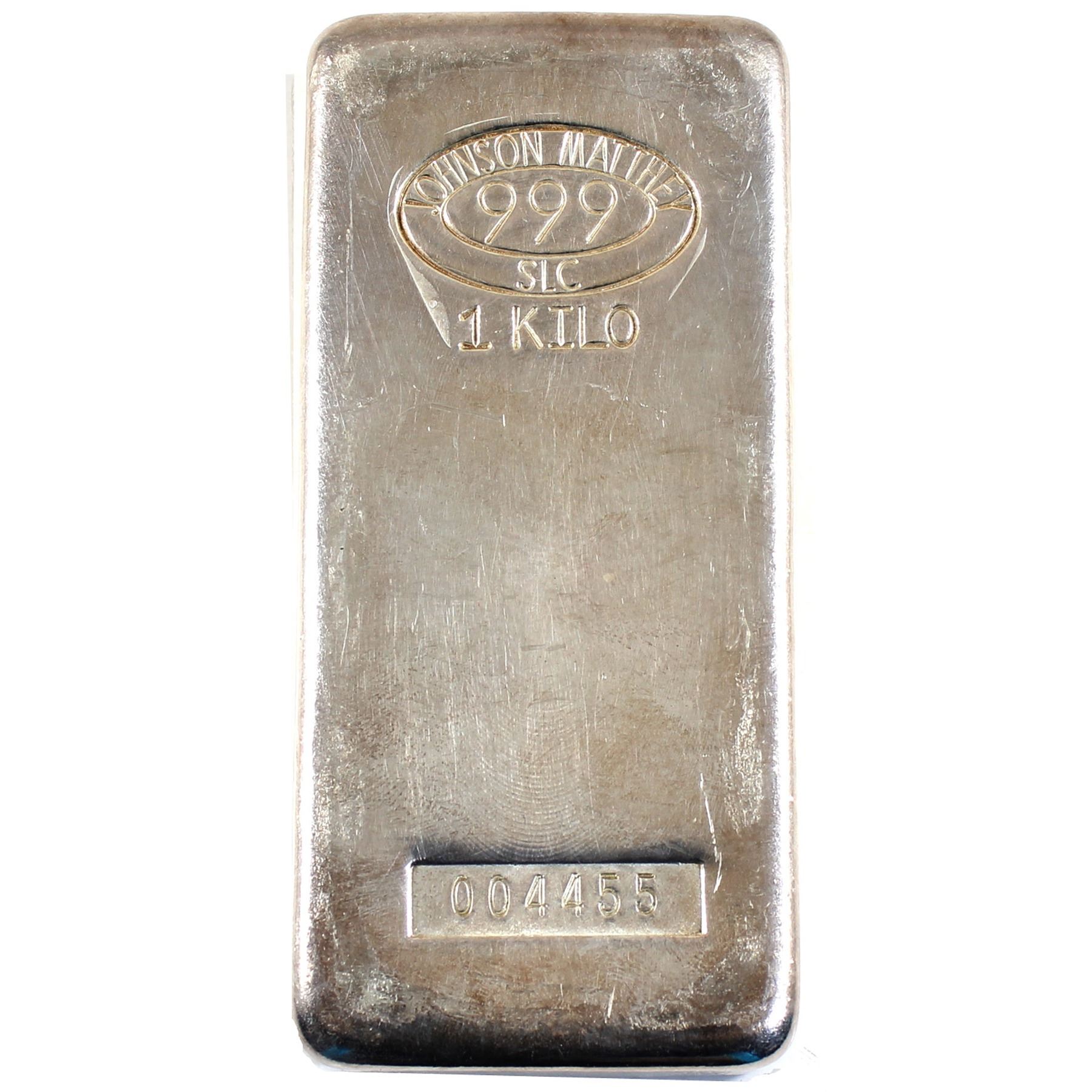 Johnson Mattey 1 Kilo Poured Silver Bar, .999 Pure with "SLC" stamped within Logo. Serial #004455 (1000g / 32.15oz Pure) Nice Clean Bar.