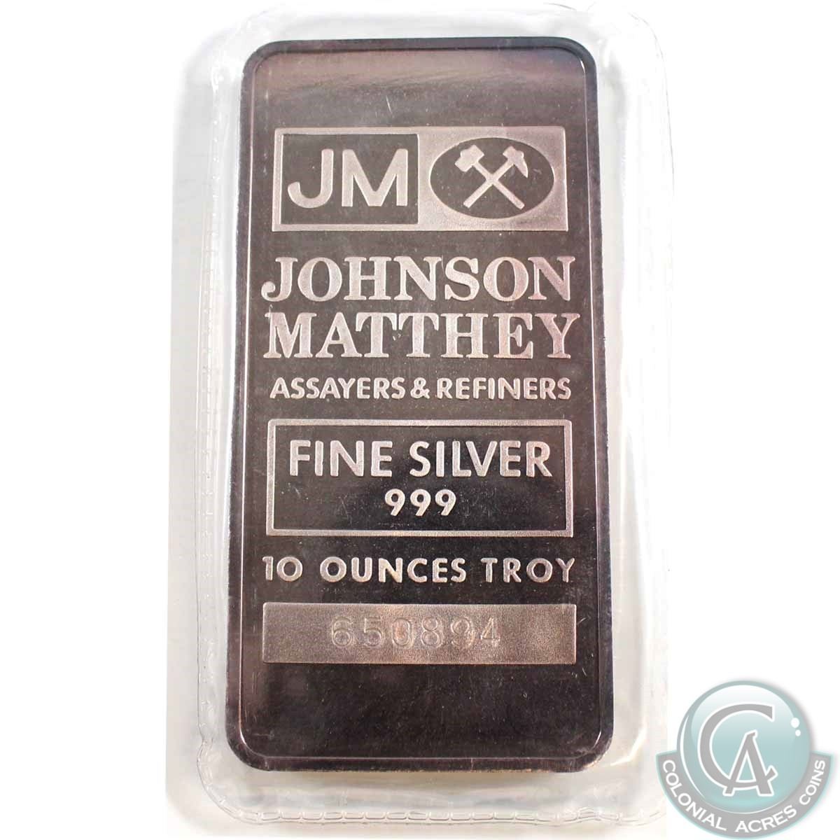 Johnson Matthey 10oz Fine Silver Bar with JM Logo in Original Wrap (TAX Exempt). Serial # 650894