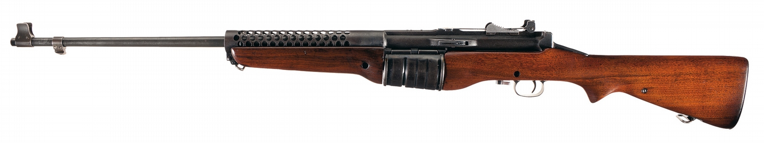 Developed in the late 1930s, the 1941 competed against the M1 Garand for US military contracts, and found buyers with the Dutch and the USMC, which issued them to the "Marine Raider and Parachute Battalions" for the early Makin Island, Guadalcanal and Tulagi Island hopping campaigns in the Pacific. Blade front and adjustable peep rear sights, with a set of three holes drilled and tapped into the top of the receiver through the standard markings, ".30-06/ 41" marked on the barrel flange, and the Cranston Arms markings on the right rear of the receiver. Smooth two piece stock with sling swivels and a checkered buttplate numbered "1201"