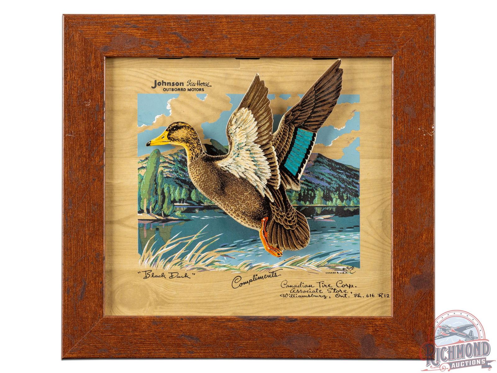 Unique Johnson Outboard framed cardboard sign with die cut and offset black duck, giving the piece a 3D look as if the bird is in flight. Sign is in excellent condition with minimal edge wear along the duck. Professionally framed with minor wear and light scratches along the frame. Marked "Black Duck" and Compliments Canadian Tire Corp. 10" H x 10.75" W.