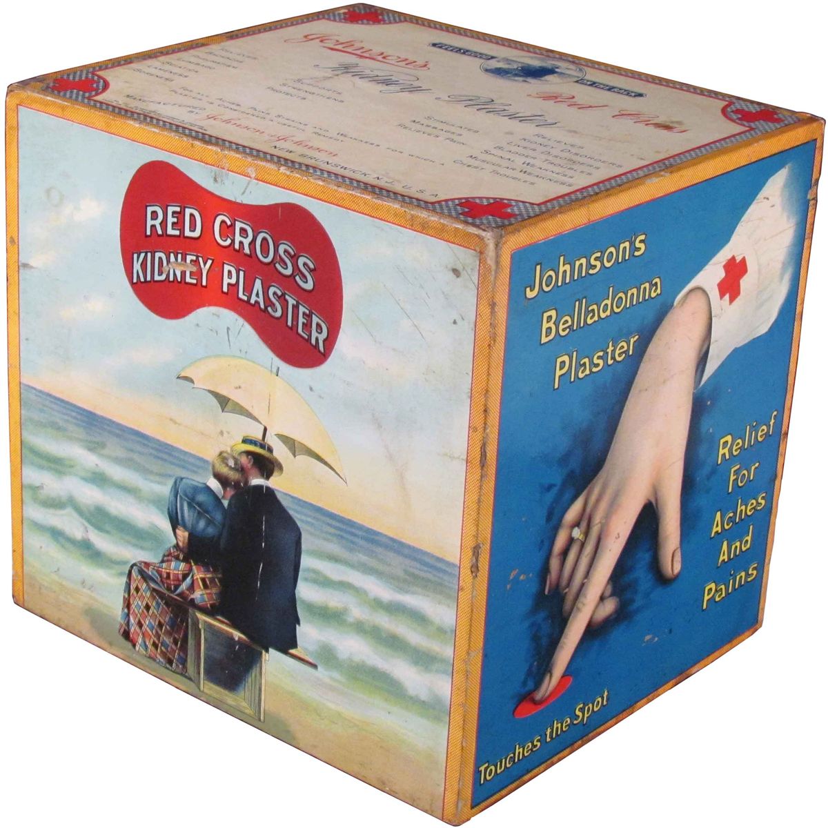Johnson's Red Cross Kidney Plaster Cardboard Store Display. Great color and graphics, four original drawers with original hardware. Some paper loss otherwise very good condition. 9 1/2 X 9 X 8 1/2 inches.