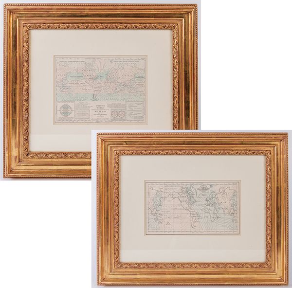 Johnson's World. Showing the Lines of Equal Magnetic Declination and the Circulation of the Winds and the Course of Stor. Two thematic world maps drawn by Professor A. Guyot, c.1858, and published in the rare 1870 edition of A. J. Johnson's Atlas of the World. The first map, "Johnson's World. Showing the Lines of Equal Magnetic Declination," is 5¾ x 10", hand-colored, "Entered according to Act of Congress in the Year 1870 by A. J. Johnson in the Clerk's Office of the District Court of the United States for the Southern District of New York." The second map, "Showing the Circulation of the Winds and the Course of Storms," is 6¼ x 8½" and "Entered according to Act of Congress in the Year 1874 by A. J. Johnson in the Office of the Librarian of Congress, at Washington." Attractively framed to 16 x 20" and 16 x 18".