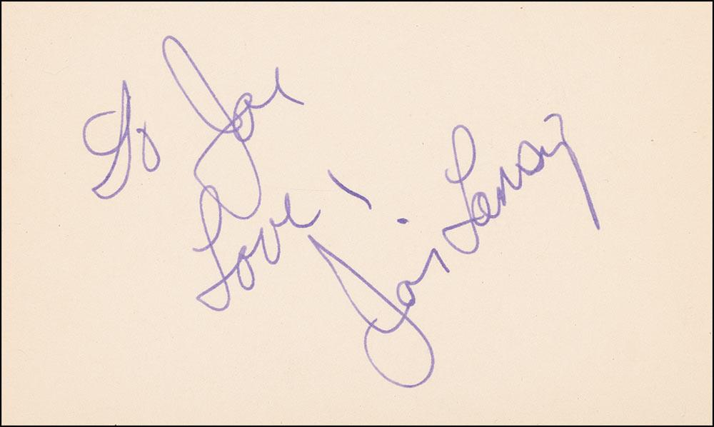 Beautiful actress who starred in a number of TV series and B movies from the 1950s until her untimely death from cancer in 1972. Vintage ink in-person signature and inscription, “To Joe, Love, Joi Lansing,” on an off-white 5 x 3 card. In very fine condition.