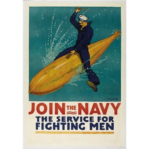 <B>Join the Navy-The Service for Fighting Men.</B></I> 28" x 42" Artist: R. F. Babcock. A fantastic image which may have provided inspiration for the final scene of Stanley Kubrick's Dr. Strangelove. The scene shows a cheerful, patriotic southern pilot astride a bomb, as though it were a bareback bronco, as it falls to earth. He waves his cowboy hat wildly, hollering and whooping, followed only by a view of a single mushroom cloud as the credits roll. This image harkens to the poster so vividly that there can be little doubt of the connection. Ripe with masculine imagery and overtones, this poster appeals to the adventurous side of the American man and calls for him to enlist. A wonderful poster with perhaps one of the most striking images of the entire war. <BR><BR>Condition: Extra Fine- two minor tears that have been mended are present in the lower quadrant; linen backed.