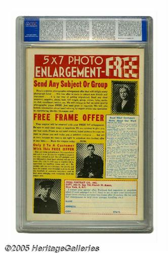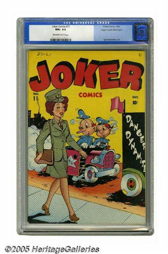 <B>Joker Comics #11 Mile High pedigree (Timely, 1943) CGC NM+ 9.6 Off-white to white pages.</B></I> Basil Wolverton contributed interior art to this issue. As for the cover, the two cops who are eyeballing a WAC when they should be watching the road are known as the Squat Car Squad. This is the only copy of the issue that has been certified by CGC as of this writing. Overstreet 2005 NM- 9.2 value = $425. CGC census 5/05: 1 in 9.6, none higher.