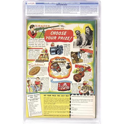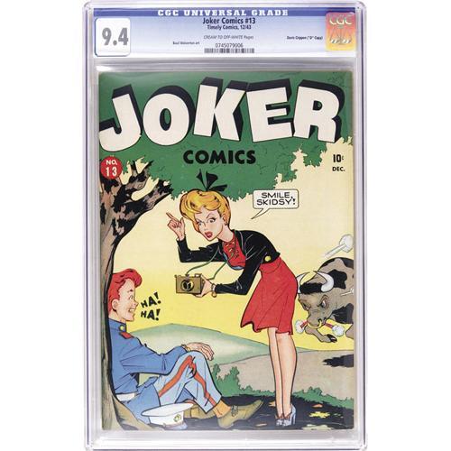 <B>Joker Comics #13 Davis Crippen ("D" Copy) pedigree (Timely, 1943) CGC NM 9.4 Cream to off-white pages.</B></I> Upon seeing the success Dell was having with its Disney adaptations in the early '40s, Timely decided to expand its humor output with this title and others. One of the big things <B>Joker</B></I> had going for it was Basil Wolverton, an artist of enormous talent whose forte was humor, as he would later show at <B>Mad</B></I> magazine among other places. This great early Timely showcases some of Wolvie's early work, and it's a 9.4 pedigreed copy to boot. Overstreet 2006 NM- 9.2 value = $450. CGC census 7/06: 1 in 9.4, none higher. <I>From the Crippen Collection.</B></I> <BR><BR><B>Important notice:</B> Heritage usually auctions material at the rate of 200-250 lots per hour. On some occasions eBay Live bid software or the Internet may not be able to keep up with the pace of the auction. We recommend placing a realistic absentee bid now as insurance to avoid disappointment. Occasionally the auctioneer may eliminate or reject an eBay Live bid, and the auctioneer may also reopen a lot after the close of the eBay live bidding (usually because we missed an audience bid), and may reject your bid even if it shows you as the winning bidder. By bidding via eBay Live, you agree that Heritage may award the lot to another bidder at its sole discretion under the circumstances described above or any other reasonable circumstances. Since eBay bids are not shown to us until we open the lot on the floor, we treat those bids just like floor bids. In most cases the floor responds before the eBay bid is presented to us, due to Internet lag time, so for consistency we have made it a policy that floor bids are always considered first over tie eBay live bids. Also please note that all Heritage lots purchased through eBay Live carry a 22.5% Buyer's Premium. Please make sure you read the Terms and Conditions before you bid. This lot is being auctioned in conjunction with a live floor auction by Heritage Auction Galleries. All final auction and invoice information will be supplied by Heritage Auction Galleries, and all other information should be considered preliminary. Lot:41001 <BR><BR><B>Winning Notification and Billing:</B> After the FINAL session in this auction is complete, Heritage will send e-mail and snail mail invoices. This process normally takes several days. All final auction and invoice information will be supplied by Heritage Auction Galleries, and all other information should be considered preliminary. <BR><BR>This auction will be conducted on a live auction floor and over the Internet through eBay Live. If you choose to place an absentee bid, please take a moment to <font color='#0000ff'><u><a href='http://pages.ebay.com/liveauctions/help/before/laabsentee.html'>learn how eBay Live absentee bidding works</a></u></font><font color='#000000'>