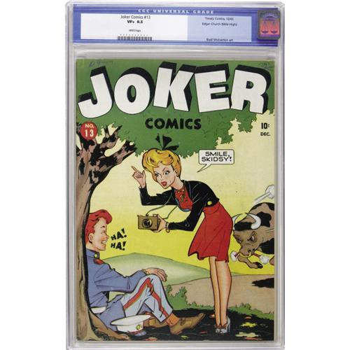 <B>Joker Comics #13 Mile High pedigree (Timely, 1943) CGC VF+ 8.5 White pages.</B></I> Basil Wolverton's Powerhouse Pepper is among the characters in this funnybook. Overstreet 2006 VF 8.0 value = $225; VF/NM 9.0 value = $338. CGC census 10/06: 1 in 8.5, 1 higher.<BR><BR><b>Shipping:</b> Slabbed Comic (<a target="_blank" href="http://www.heritageauctions.com/common/shipping.php">view shipping information</a>)