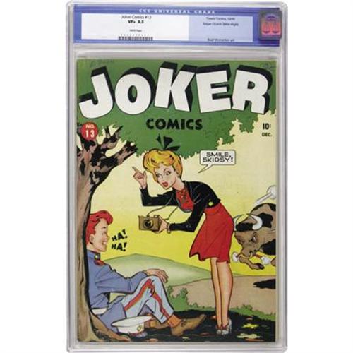 <B>Joker Comics #13 Mile High pedigree (Timely, 1943) CGC VF+ 8.5 White pages.</B></I> Basil Wolverton's Powerhouse Pepper is among the characters in this funnybook. Overstreet 2007 VF 8.0 value = $224; VF/NM 9.0 value = $350. CGC census 6/07: 1 in 8.5, 1 higher.<BR><BR><b>Shipping:</b> Comics - Slabbed (certified) (<a target="_blank" href="http://www.heritageauctions.com/common/shipping.php">view shipping information</a>)