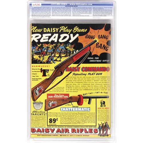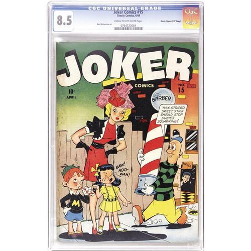 <B>Joker Comics #15 Davis Crippen ("D" Copy) pedigree (Timely, 1944) CGC VF+ 8.5 Cream to off-white pages.</B></I> We believe these issues to be much scarcer than the reference books would indicate -- the only other copy of this we'd ever seen was the Mile High copy -- that one and this "D" copy are the only two on CGC's census as of this writing. The cover offers one of the few times Powerhouse Pepper was drawn by someone other than Basil Wolverton, but fear not, Wolverton fans, there's art by your fave inside the issue. Overstreet 2006 VF 8.0 value = $225; VF/NM 9.0 value = $338. CGC census 6/06: 1 in 8.5, 1 higher. <I>From the Crippen Collection.</B></I> <BR><BR><B>Important notice:</B> Heritage usually auctions material at the rate of 200-250 lots per hour. On some occasions eBay Live bid software or the Internet may not be able to keep up with the pace of the auction. We recommend placing a realistic absentee bid now as insurance to avoid disappointment. Occasionally the auctioneer may eliminate or reject an eBay Live bid, and the auctioneer may also reopen a lot after the close of the eBay live bidding (usually because we missed an audience bid), and may reject your bid even if it shows you as the winning bidder. By bidding via eBay Live, you agree that Heritage may award the lot to another bidder at its sole discretion under the circumstances described above or any other reasonable circumstances. Since eBay bids are not shown to us until we open the lot on the floor, we treat those bids just like floor bids. In most cases the floor responds before the eBay bid is presented to us, due to Internet lag time, so for consistency we have made it a policy that floor bids are always considered first over tie eBay live bids. Also please note that all Heritage lots purchased through eBay Live carry a 22.5% Buyer's Premium. Please make sure you read the Terms and Conditions before you bid. This lot is being auctioned in conjunction with a live floor auction by Heritage Auction Galleries. All final auction and invoice information will be supplied by Heritage Auction Galleries, and all other information should be considered preliminary. Lot:41001 <BR><BR><B>Winning Notification and Billing:</B> After the FINAL session in this auction is complete, Heritage will send e-mail and snail mail invoices. This process normally takes several days. All final auction and invoice information will be supplied by Heritage Auction Galleries, and all other information should be considered preliminary. <BR><BR>This auction will be conducted on a live auction floor and over the Internet through eBay Live. If you choose to place an absentee bid, please take a moment to <font color='#0000ff'><u><a href='http://pages.ebay.com/liveauctions/help/before/laabsentee.html'>learn how eBay Live absentee bidding works</a></u></font><font color='#000000'>