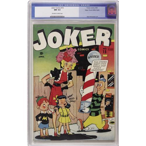 <B>Joker Comics #15 Mile High pedigree (Timely, 1944) CGC NM 9.4 Off-white to white pages.</B></I> Powerhouse Pepper stars in the issue, which has Basil Wolverton interior art. This is a beautiful copy! Overstreet 2006 NM- 9.2 value = $450. CGC census 10/06: 1 in 9.4, none higher.<BR><BR><b>Shipping:</b> Slabbed Comic (<a target="_blank" href="http://www.heritageauctions.com/common/shipping.php">view shipping information</a>)