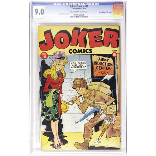 <B>Joker Comics #16 Davis Crippen ("D" Copy) pedigree (Timely, 1944) CGC VF/NM 9.0 Cream to off-white pages.</B></I> No copy of this Timely has been graded higher (including the Mile High, which received a "Qualified" grade)! Tessie the Typist is the cover feature, and her boyfriend Skidsy's the co-star. Inside the book, there's a Powerhouse Pepper story drawn by Basil Wolverton. Overstreet 2006 VF/NM 9.0 value = $338; NM- 9.2 value = $450. CGC census 6/06: 1 in 9.0, none higher. <I>From the Crippen Collection.</B></I> <BR><BR><B>Important notice:</B> Heritage usually auctions material at the rate of 200-250 lots per hour. On some occasions eBay Live bid software or the Internet may not be able to keep up with the pace of the auction. We recommend placing a realistic absentee bid now as insurance to avoid disappointment. Occasionally the auctioneer may eliminate or reject an eBay Live bid, and the auctioneer may also reopen a lot after the close of the eBay live bidding (usually because we missed an audience bid), and may reject your bid even if it shows you as the winning bidder. By bidding via eBay Live, you agree that Heritage may award the lot to another bidder at its sole discretion under the circumstances described above or any other reasonable circumstances. Since eBay bids are not shown to us until we open the lot on the floor, we treat those bids just like floor bids. In most cases the floor responds before the eBay bid is presented to us, due to Internet lag time, so for consistency we have made it a policy that floor bids are always considered first over tie eBay live bids. Also please note that all Heritage lots purchased through eBay Live carry a 22.5% Buyer's Premium. Please make sure you read the Terms and Conditions before you bid. This lot is being auctioned in conjunction with a live floor auction by Heritage Auction Galleries. All final auction and invoice information will be supplied by Heritage Auction Galleries, and all other information should be considered preliminary. Lot:41001 <BR><BR><B>Winning Notification and Billing:</B> After the FINAL session in this auction is complete, Heritage will send e-mail and snail mail invoices. This process normally takes several days. All final auction and invoice information will be supplied by Heritage Auction Galleries, and all other information should be considered preliminary. <BR><BR>This auction will be conducted on a live auction floor and over the Internet through eBay Live. If you choose to place an absentee bid, please take a moment to <font color='#0000ff'><u><a href='http://pages.ebay.com/liveauctions/help/before/laabsentee.html'>learn how eBay Live absentee bidding works</a></u></font><font color='#000000'>