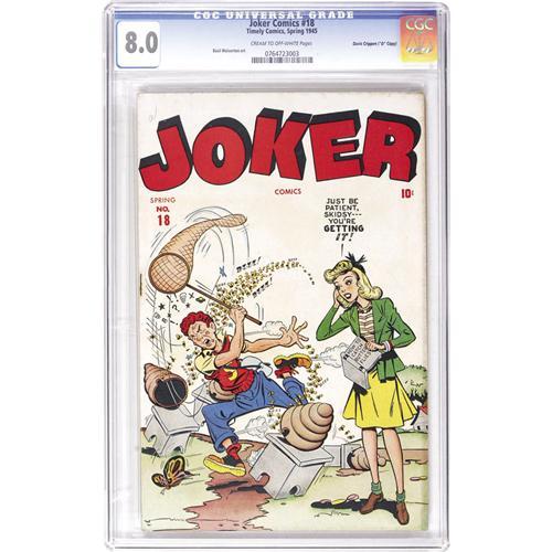 <B>Joker Comics #18 Davis Crippen ("D" Copy) pedigree (Timely, 1945) CGC VF 8.0 Cream to off-white pages.</B></I> Here's a very nice copy of this Timely humor mag - only the Mile High copy has been graded higher! Basil Wolverton's Powerhouse Pepper appears in the issue. The cover features Tessie the Typist and Skidsy - the latter looked more Archie-like with each passing month! No accident, we suspect. Overstreet 2006 VF 8.0 value = $225. CGC census 6/06: 1 in 8.0, 1 higher. <I>From the Crippen Collection.</B></I> <BR><BR><B>Important notice:</B> Heritage usually auctions material at the rate of 200-250 lots per hour. On some occasions eBay Live bid software or the Internet may not be able to keep up with the pace of the auction. We recommend placing a realistic absentee bid now as insurance to avoid disappointment. Occasionally the auctioneer may eliminate or reject an eBay Live bid, and the auctioneer may also reopen a lot after the close of the eBay live bidding (usually because we missed an audience bid), and may reject your bid even if it shows you as the winning bidder. By bidding via eBay Live, you agree that Heritage may award the lot to another bidder at its sole discretion under the circumstances described above or any other reasonable circumstances. Since eBay bids are not shown to us until we open the lot on the floor, we treat those bids just like floor bids. In most cases the floor responds before the eBay bid is presented to us, due to Internet lag time, so for consistency we have made it a policy that floor bids are always considered first over tie eBay live bids. Also please note that all Heritage lots purchased through eBay Live carry a 22.5% Buyer's Premium. Please make sure you read the Terms and Conditions before you bid. This lot is being auctioned in conjunction with a live floor auction by Heritage Auction Galleries. All final auction and invoice information will be supplied by Heritage Auction Galleries, and all other information should be considered preliminary. Lot:41001 <BR><BR><B>Winning Notification and Billing:</B> After the FINAL session in this auction is complete, Heritage will send e-mail and snail mail invoices. This process normally takes several days. All final auction and invoice information will be supplied by Heritage Auction Galleries, and all other information should be considered preliminary. <BR><BR>This auction will be conducted on a live auction floor and over the Internet through eBay Live. If you choose to place an absentee bid, please take a moment to <font color='#0000ff'><u><a href='http://pages.ebay.com/liveauctions/help/before/laabsentee.html'>learn how eBay Live absentee bidding works</a></u></font><font color='#000000'>