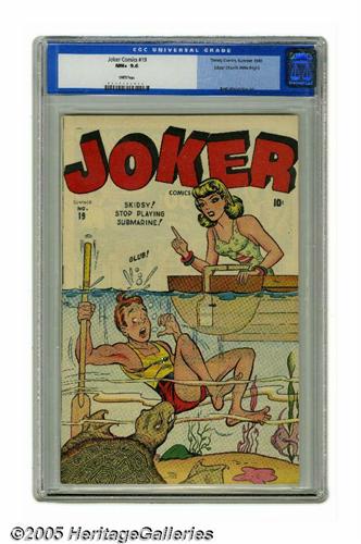 <B>Joker Comics #19 Mile High pedigree (Timely, 1945) CGC NM+ 9.6 White pages.</B></I> Timely's Archie-esque character Skidsy never really caught on, but at least we can enjoy him cavorting with various "good girls" on a run of <B>Joker Comics</B></I> covers. The remainder of the cast is highlighted by Basil Wolverton's Powerhouse Pepper. Overstreet 2005 NM- 9.2 value = $425. CGC census 5/05: 1 in 9.6, none higher.