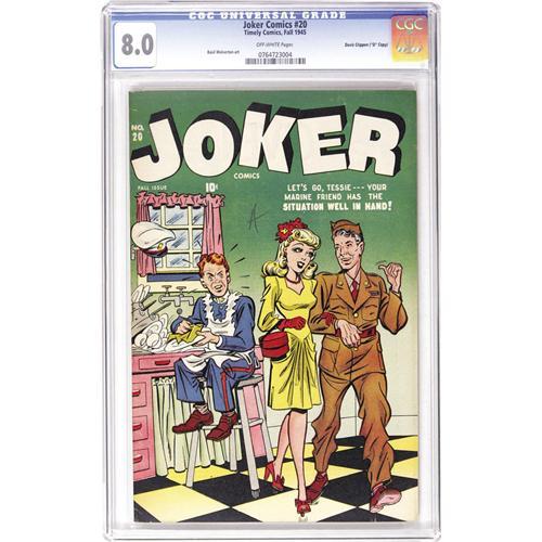 <B>Joker Comics #20 Davis Crippen ("D" Copy) pedigree (Timely, 1945) CGC VF 8.0 Off-white pages.</B></I> We hadn't seen a copy of this Timely in four years, and wouldn't be surprised if that much time passes before the next one! Tessie the Typist and Skidsy are the cover stars, and Powerhouse Pepper, drawn by Basil Wolverton, appears inside. Overstreet 2006 VF 8.0 value = $225. CGC census 6/06: 1 in 8.0, 1 higher. <I>From the Crippen Collection</B></I> <BR><BR><B>Important notice:</B> Heritage usually auctions material at the rate of 200-250 lots per hour. On some occasions eBay Live bid software or the Internet may not be able to keep up with the pace of the auction. We recommend placing a realistic absentee bid now as insurance to avoid disappointment. Occasionally the auctioneer may eliminate or reject an eBay Live bid, and the auctioneer may also reopen a lot after the close of the eBay live bidding (usually because we missed an audience bid), and may reject your bid even if it shows you as the winning bidder. By bidding via eBay Live, you agree that Heritage may award the lot to another bidder at its sole discretion under the circumstances described above or any other reasonable circumstances. Since eBay bids are not shown to us until we open the lot on the floor, we treat those bids just like floor bids. In most cases the floor responds before the eBay bid is presented to us, due to Internet lag time, so for consistency we have made it a policy that floor bids are always considered first over tie eBay live bids. Also please note that all Heritage lots purchased through eBay Live carry a 22.5% Buyer's Premium. Please make sure you read the Terms and Conditions before you bid. This lot is being auctioned in conjunction with a live floor auction by Heritage Auction Galleries. All final auction and invoice information will be supplied by Heritage Auction Galleries, and all other information should be considered preliminary. Lot:41001 <BR><BR><B>Winning Notification and Billing:</B> After the FINAL session in this auction is complete, Heritage will send e-mail and snail mail invoices. This process normally takes several days. All final auction and invoice information will be supplied by Heritage Auction Galleries, and all other information should be considered preliminary. <BR><BR>This auction will be conducted on a live auction floor and over the Internet through eBay Live. If you choose to place an absentee bid, please take a moment to <font color='#0000ff'><u><a href='http://pages.ebay.com/liveauctions/help/before/laabsentee.html'>learn how eBay Live absentee bidding works</a></u></font><font color='#000000'>