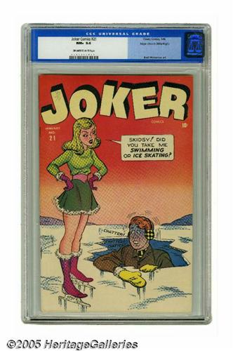 <B>Joker Comics #21 (Timely, 1946) CGC NM+ 9.6 Off-white to white pages.</B></I> It would be quite a challenge to find a run of this series in any condition, never mind top-grade copies such as we're offering here! Inside the comic is a Powerhouse Pepper story with art by Basil Wolverton. This is the only copy of this issue that CGC has certified to date. Overstreet 2005 NM- 9.2 value = $360. CGC census 5/05: 1 in 9.6, none higher.